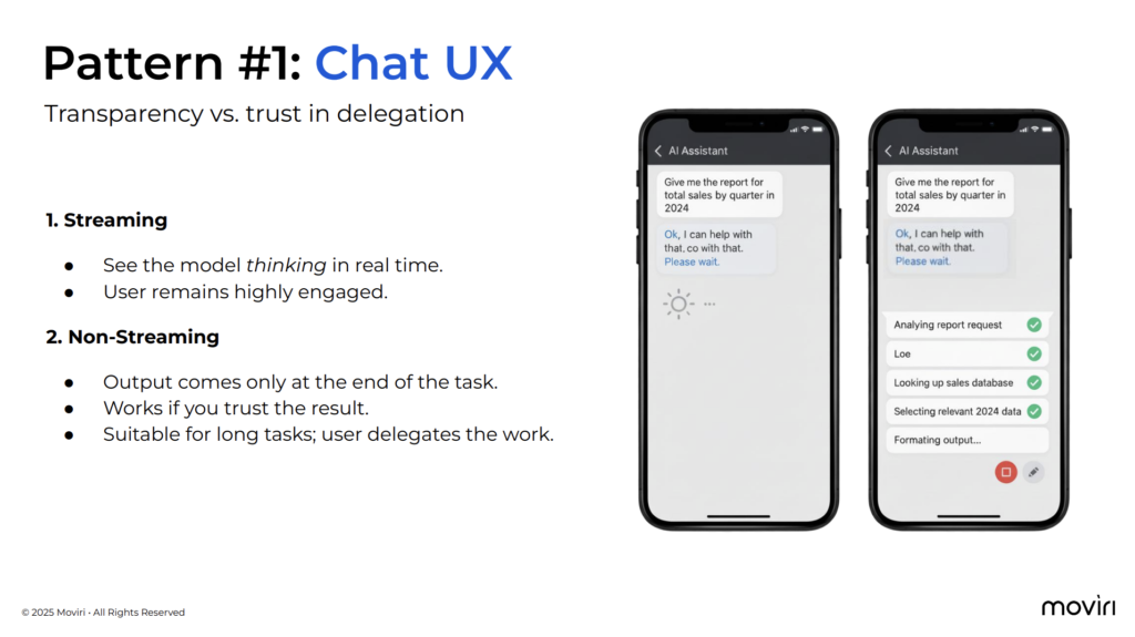 Not just a text window. Streaming mode shows the agent “thinking” in real time. Non-streaming delivers the result only when the task is complete: ideal for longer tasks where users want to delegate without following every step.