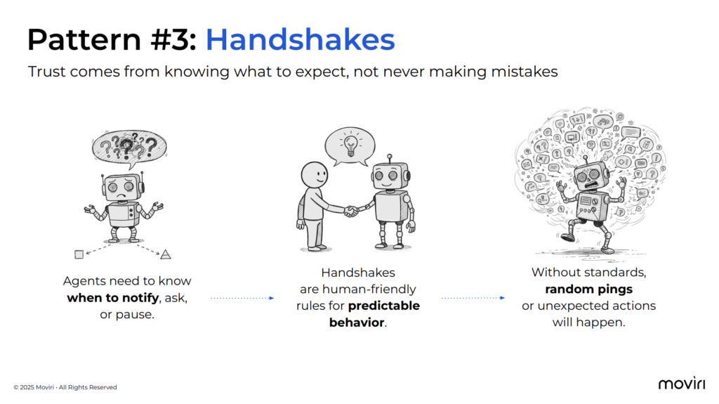 Shared rules that define when an agent notifies, asks for confirmation, or pauses to wait. Without standards, agents become chaotic and unpredictable. With handshakes, every interaction is expected and understandable.