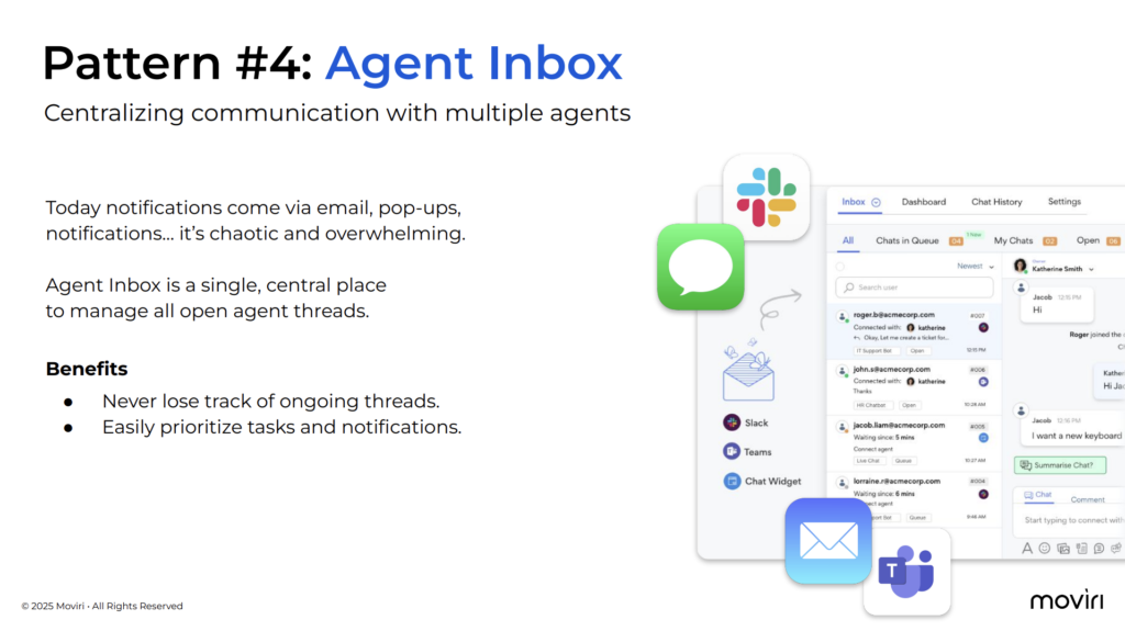 A single control center for managing all open agent threads. No more notifications scattered across emails, pop-ups, and apps. Everything in one place, prioritized and clear.